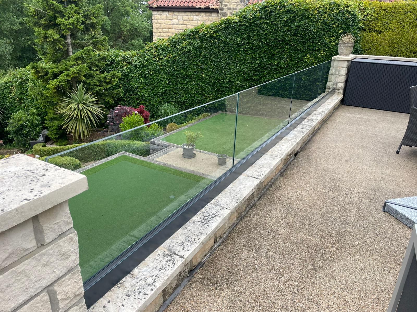 View ProjectOld timber balustrade and coping stones removed, and channel installed to wall cavity, 17.5mm glass fitted and new coping stones fitted either side of the glass hiding the channel to give a truly frameless look.