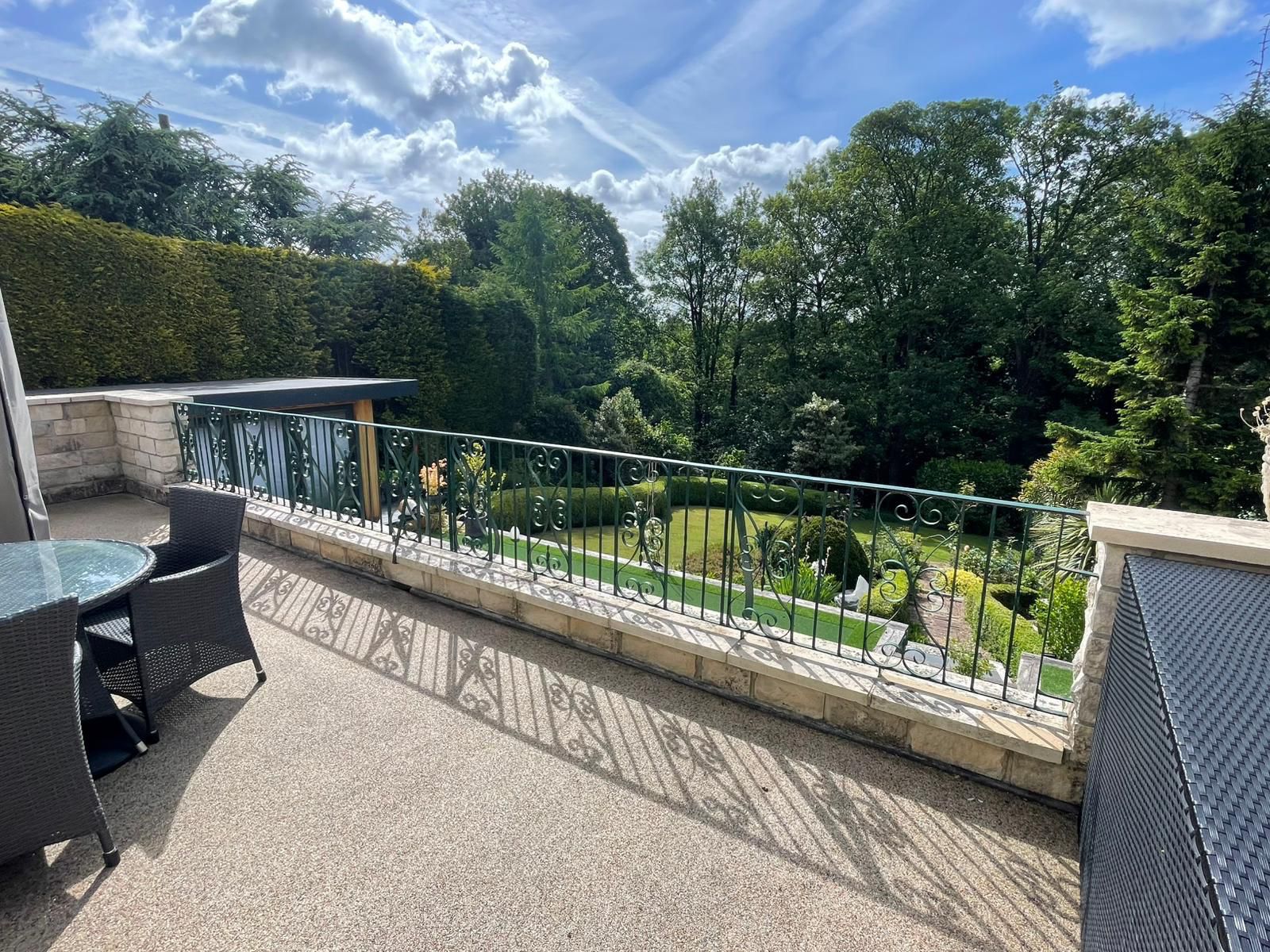 The customer had an old iron railing balustrade which required constant sanding and re painting. It was also instructing his view of the garden and woodland. We removed this old railing system and replaced it white a modern sleek anthracite channel and 17.5mm toughened laminated glass system.